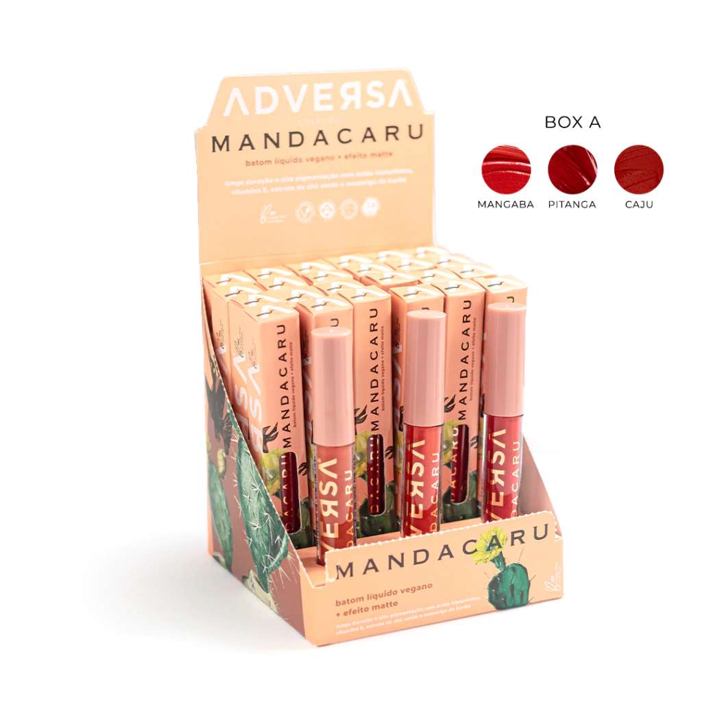 Aumente suas vendas com nosso BOX Display do Batom Líquido Matte Vegano da Coleção #Mandacaru da Adversa Makeup, no box você leva as 6 cores com provador.