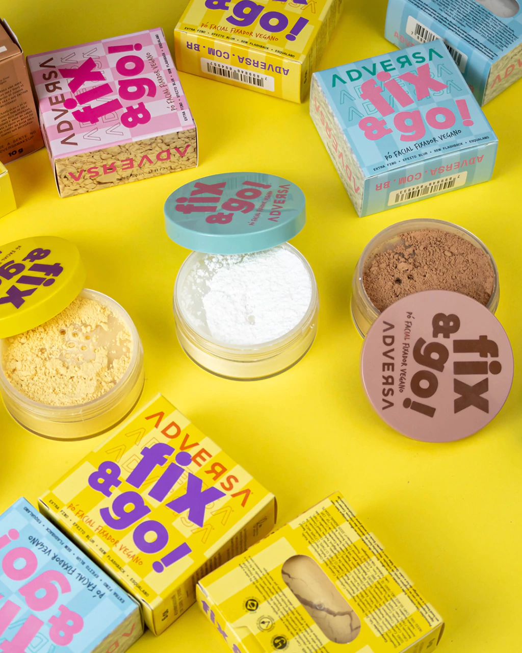 Aumente suas vendas com o Box de 12 unidades de Pó Fixador Vegano Fix & Go! Banana da Adversa Makeup, não acompanha provador.