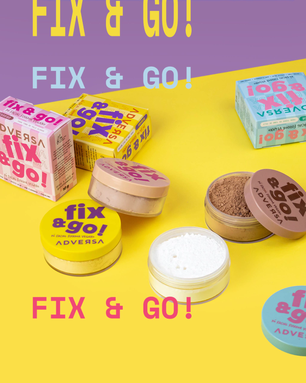 Aumente suas vendas com o Box de 12 unidades de Pó Fixador Vegano Fix & Go! Chocolate da Adversa Makeup, não acompanha provador.