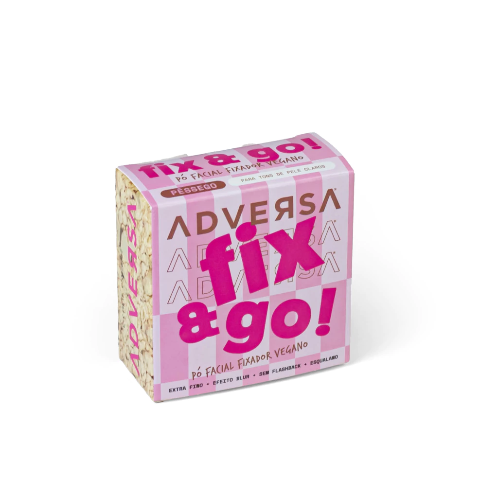 Aumente suas vendas com o Box de 12 unidades de Pó Fixador Vegano Fix & Go! Pêssego da Adversa Makeup, não acompanha provador.